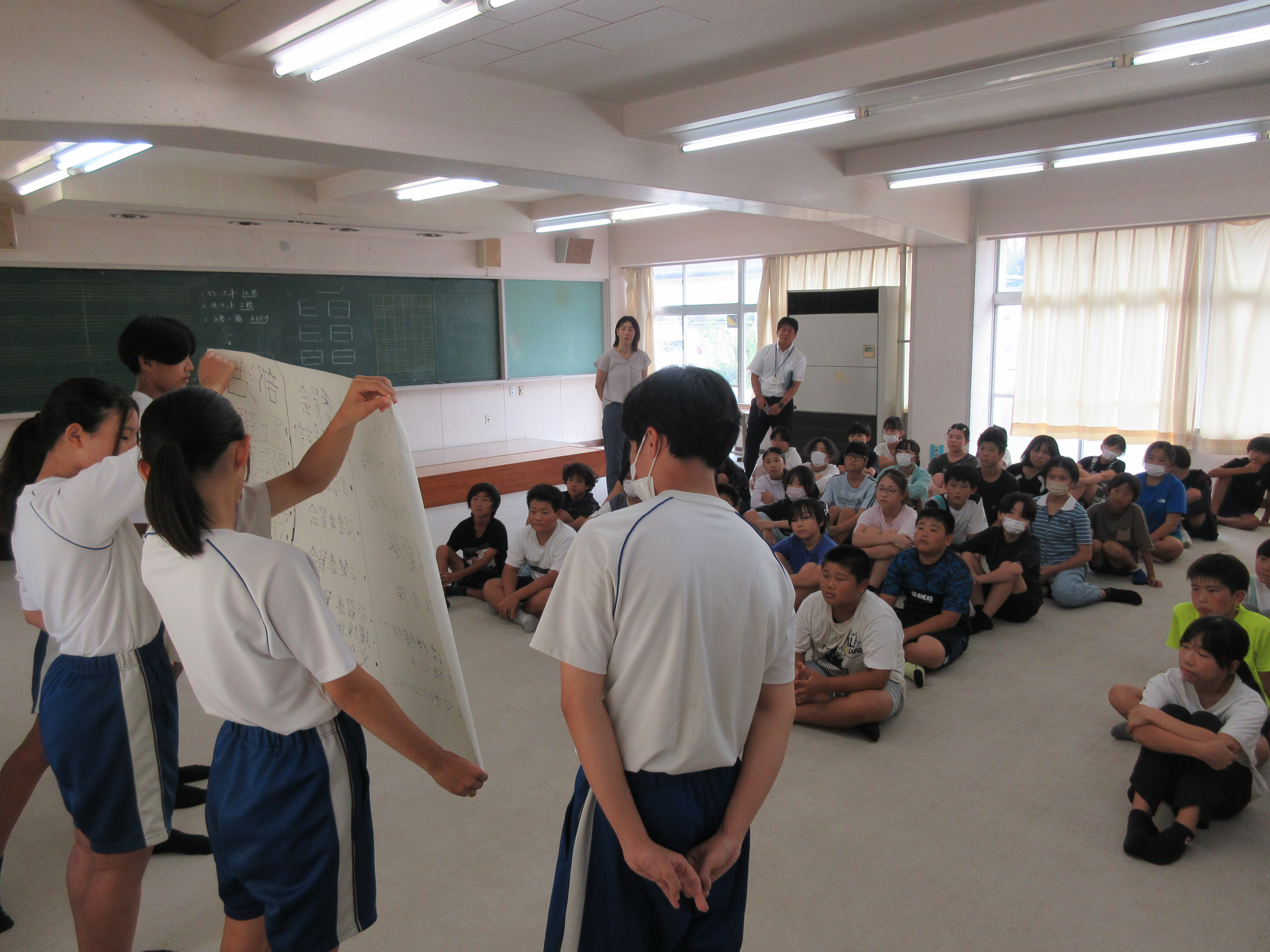 職業体験に来てくれている相良中学校の2年生が、6年生に向けて中学校生活についてお話をしてくれました。