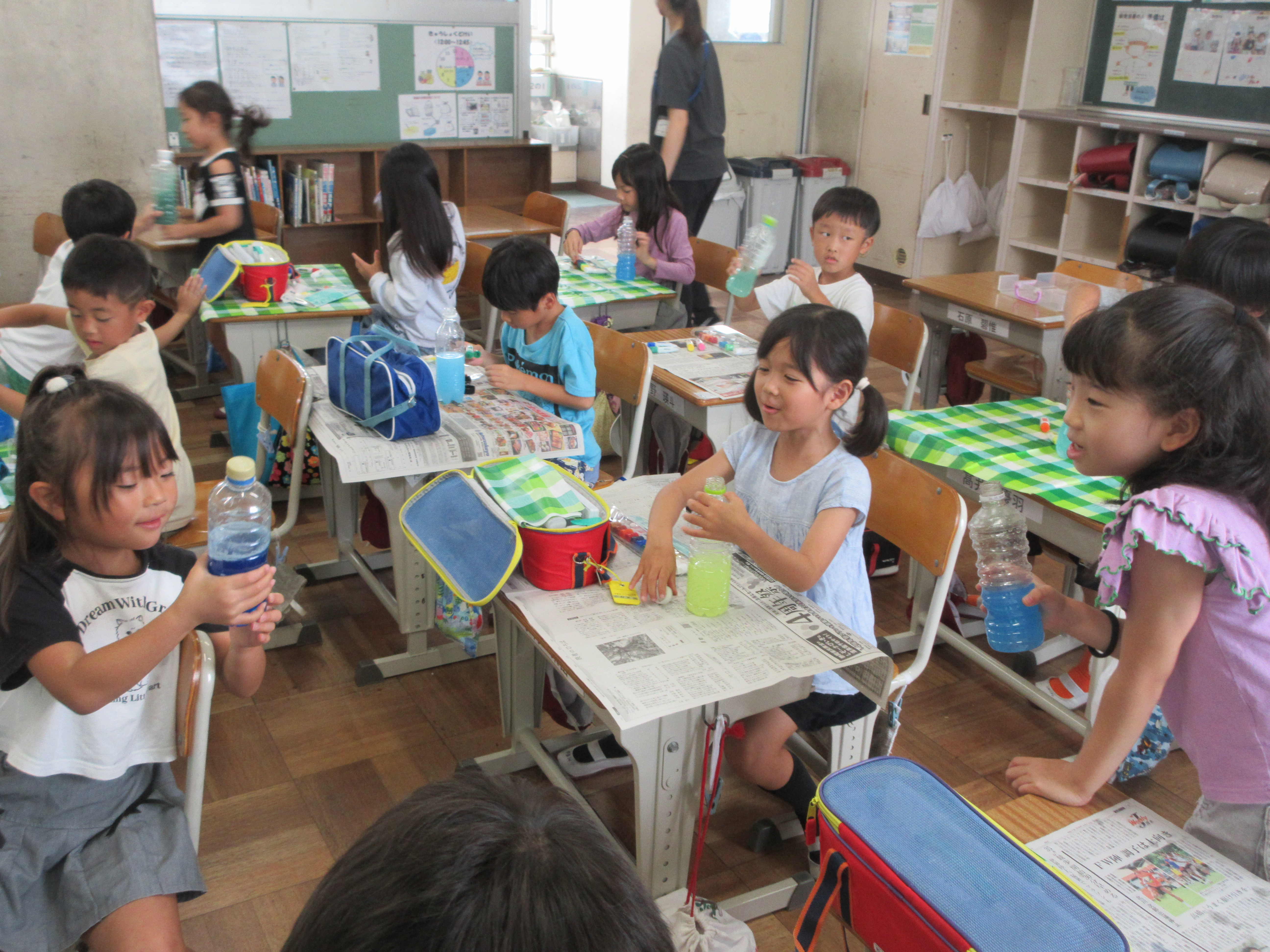 9月18日(木)の2・3時間目に、1年生は図工の学習でカラフル色水づくりをしました。