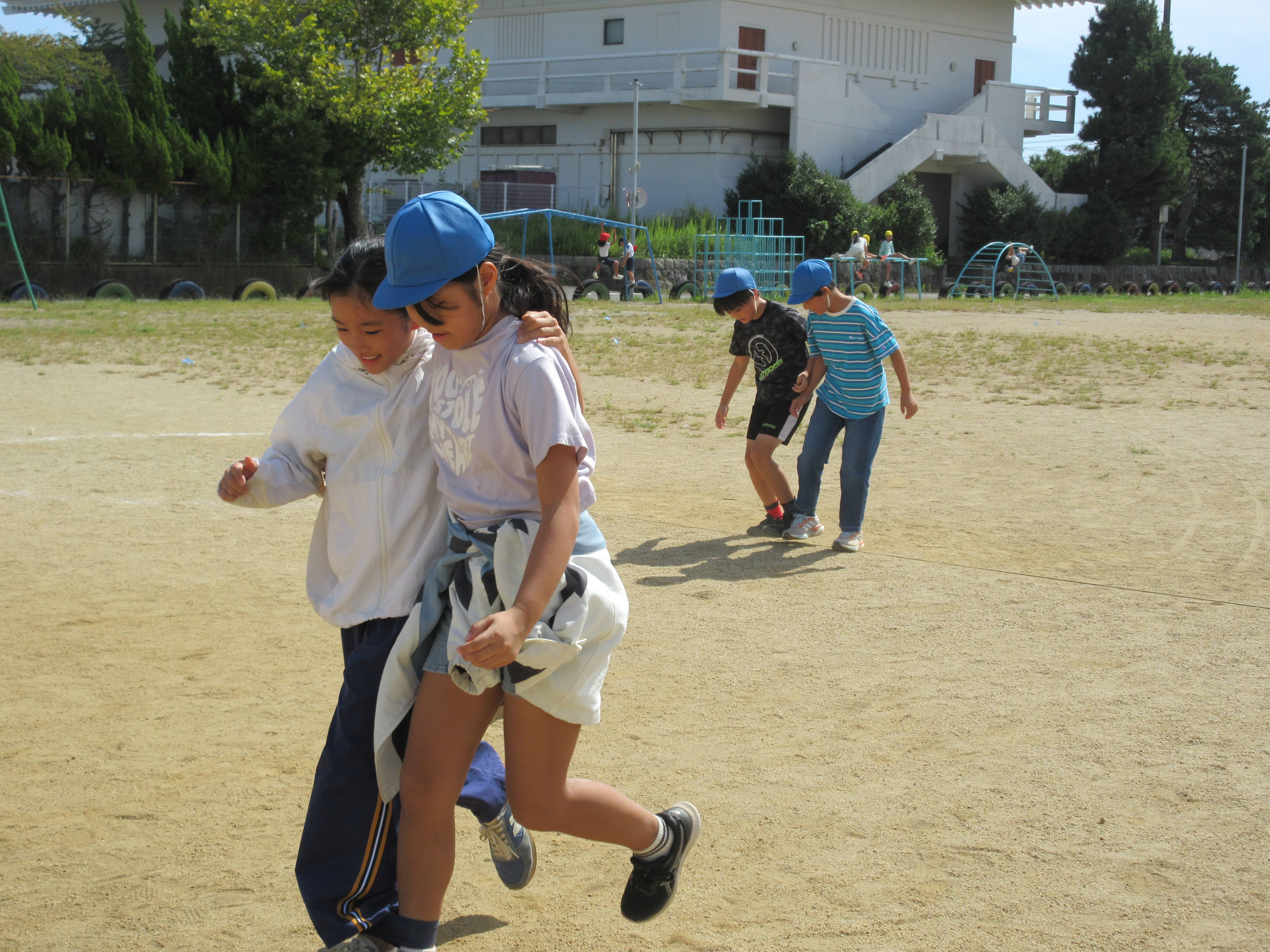 今日は、いきいきタイムに5年生が学年種目の自主練習をしていました。二人三脚リレーが学年種目となり、ペアと息を合わせて速く走れるように練習しています。まだまだ息が合わなかったり転びそうになったりしていますが、これからたくさん練習し、当日はきっと素晴らしい走りになることと期待しています。