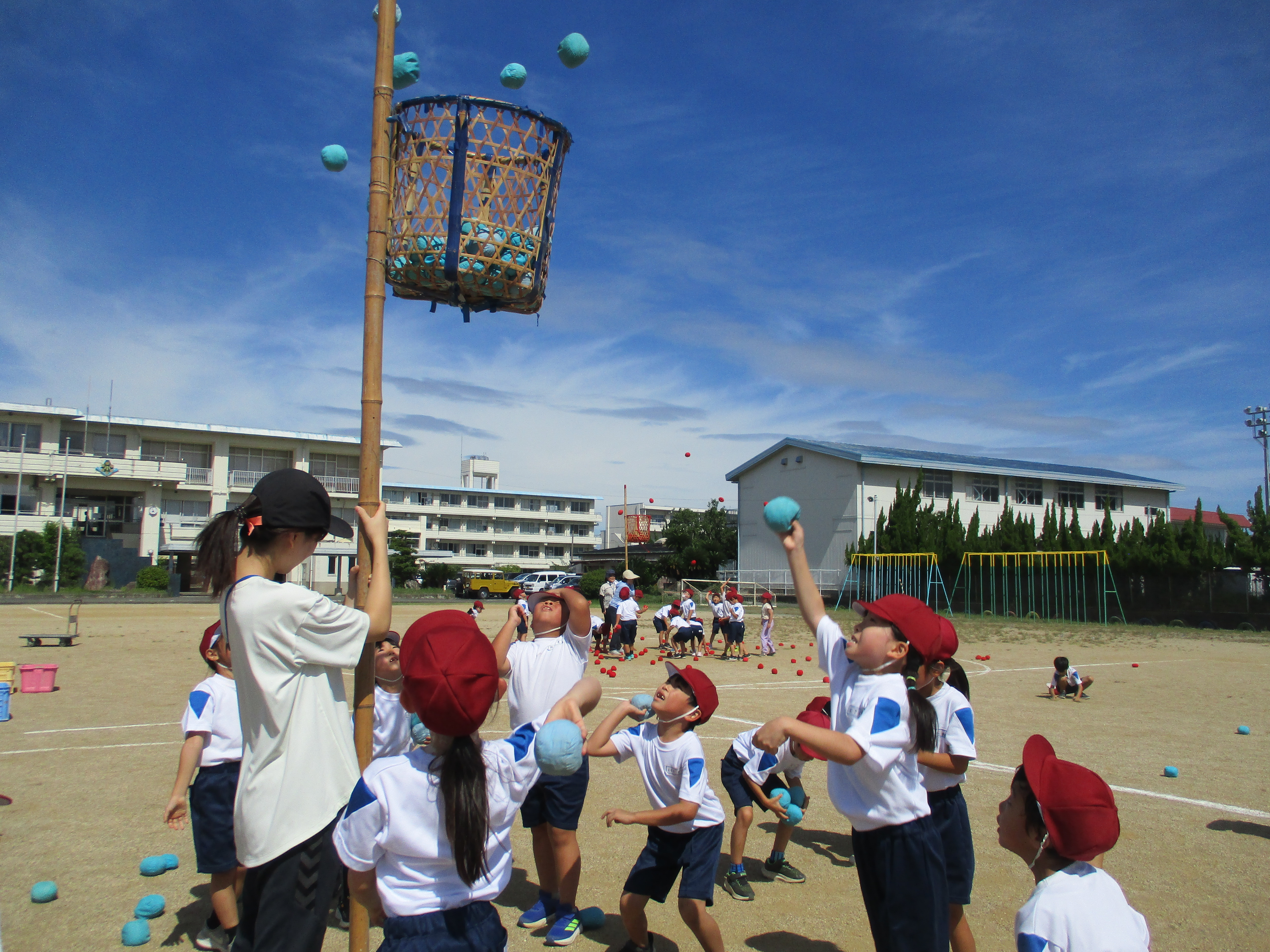 今日は、初めてグラウンドで実際に玉入れを行いました。結果は、23対16で青組(1組)が勝ちました。子供たちに聞いてみると、作戦通りにはいかなかったようですが、球がかごに入ったことをとても喜んでいました。これから競い合って何度も練習し、上手にかごに入れられるようになることと思います。