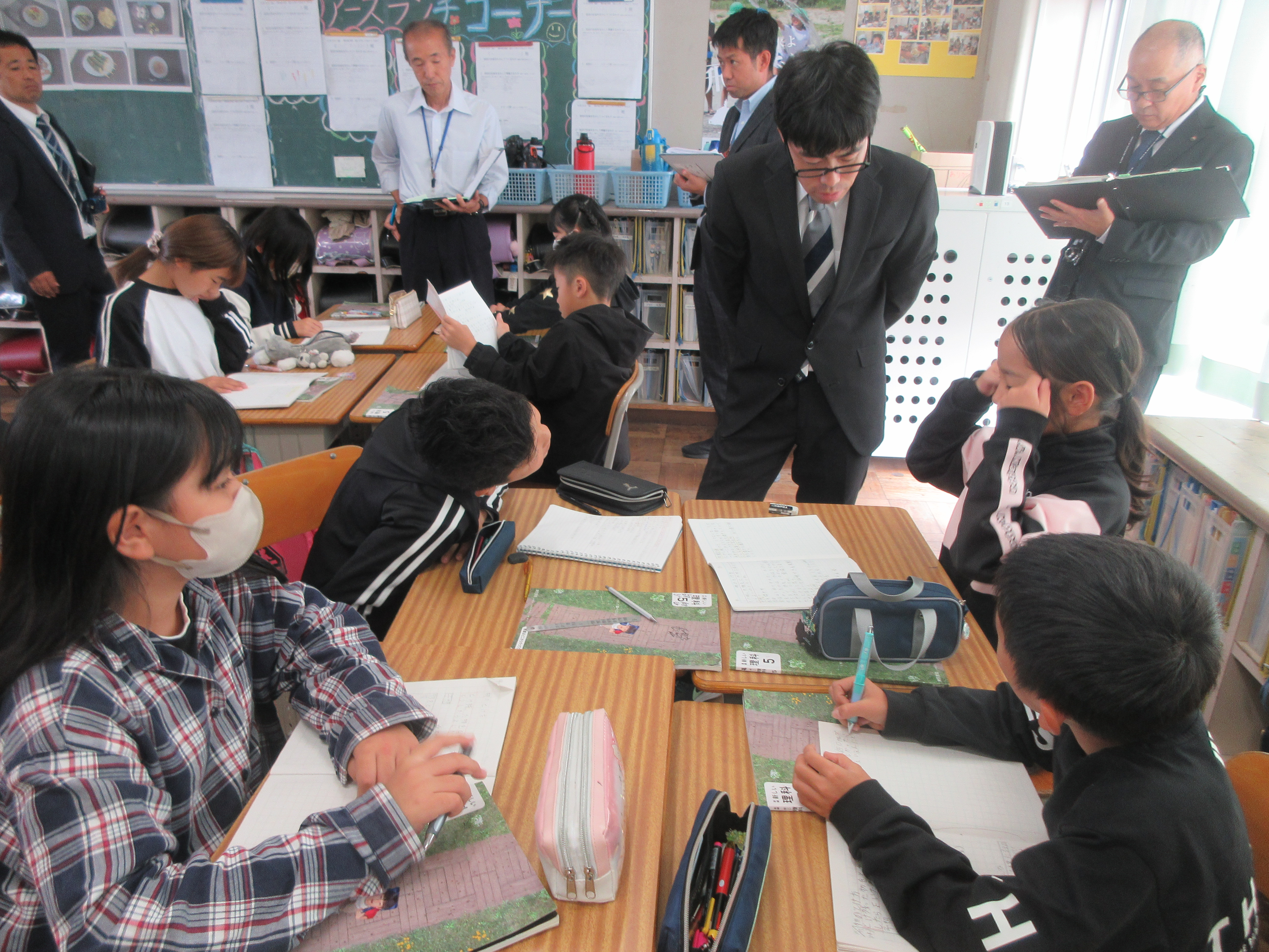 10月29日(水)に、教育事務所の先生方をお招きして教職員の研修会を開くにあたり、全クラスの授業を見ていただきました。どのクラスも、真剣に考えたり活動したり、子供同士が話し合ったりして学んでいる様子が見られ、来校した先生からお褒めの言葉をいただきました。
