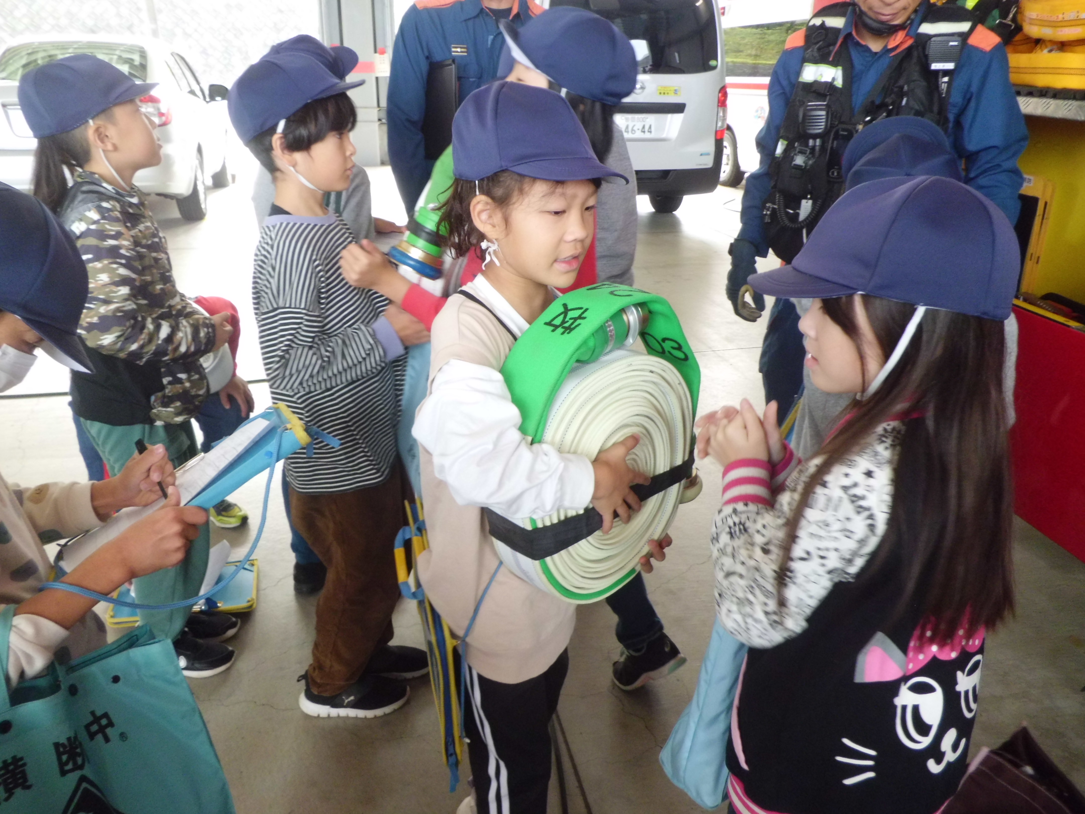 11月7日(金)に、今度は3年2組の子供たちが社会科見学で牧之原消防署を訪れました。消防署の施設の説明を聞いたり、署内の見学をさせてもらったりしました。各消防車の働きや仕組みを教えていただき、載せている道具を触らせてもらったりしました。また、放水体験もさせてもらい、消防の仕事の大変さを理解することができました。